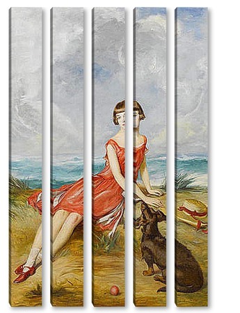 Модульная картина Портрет молодой девушки с ее собакой на берегу моря Портрет молодой девушки с ее собакой на берегу моря