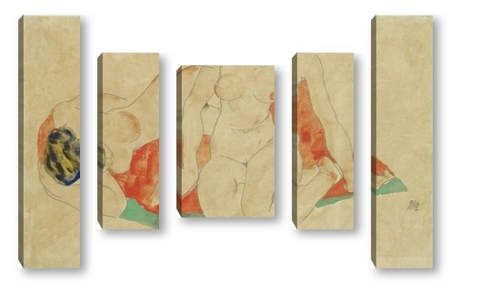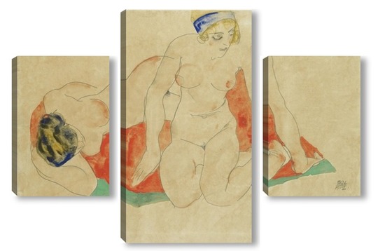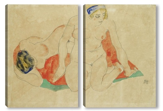 Модульная картина ЛЕЖАЩАЯ и СИДЯЩАЯ женщина ню на красной и зеленой ткани ЛЕЖАЩАЯ и СИДЯЩАЯ женщина ню на красной и зеленой ткани