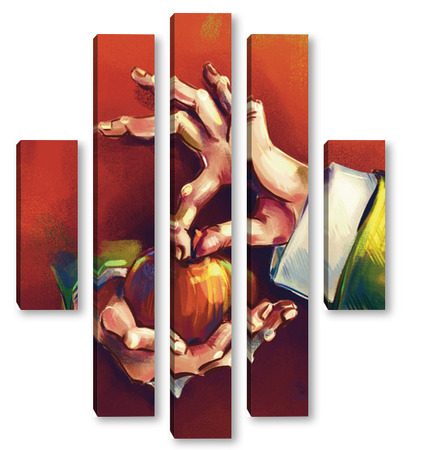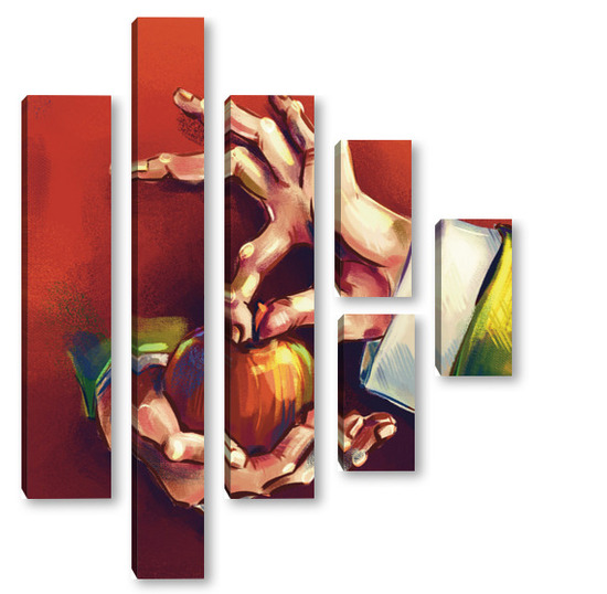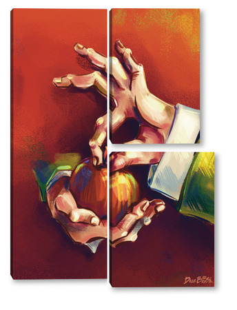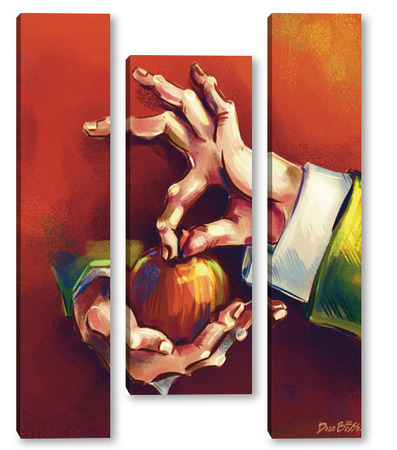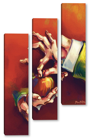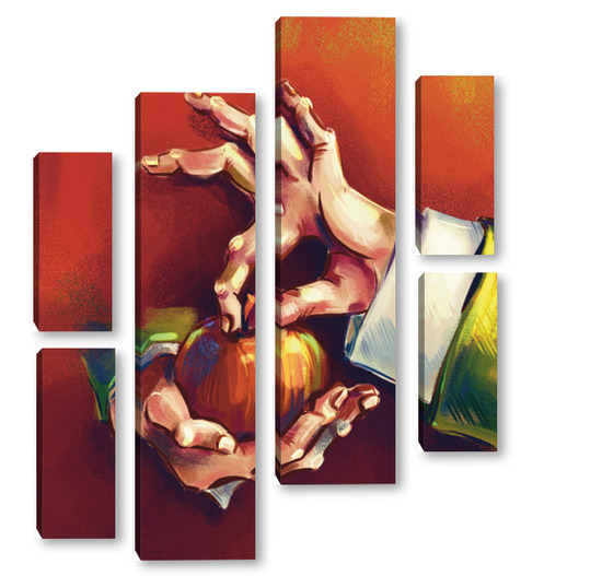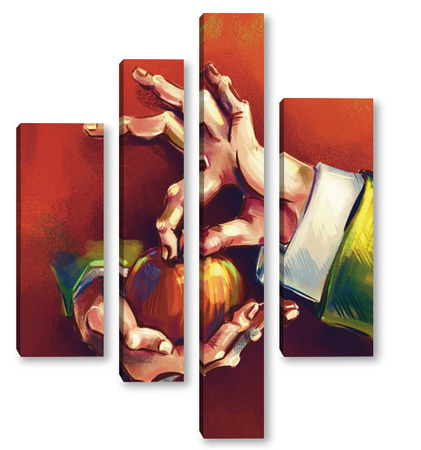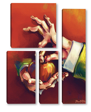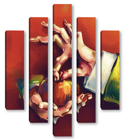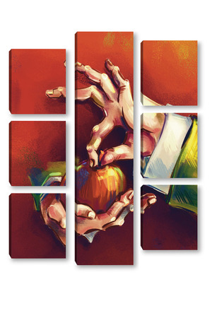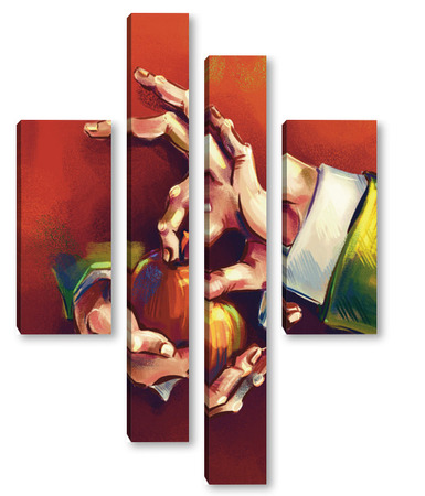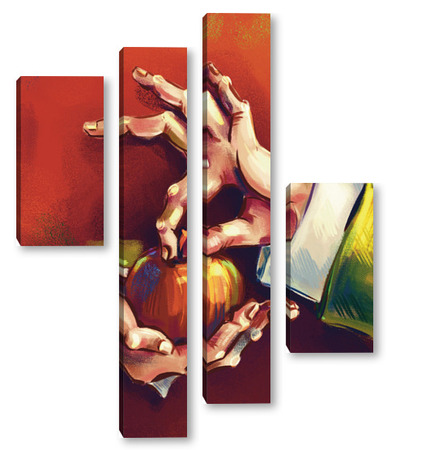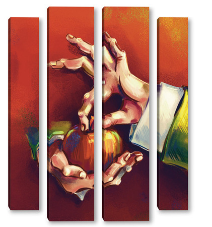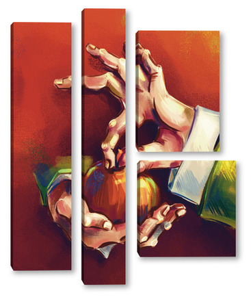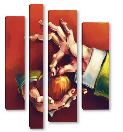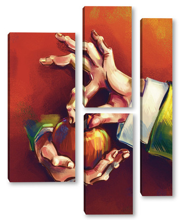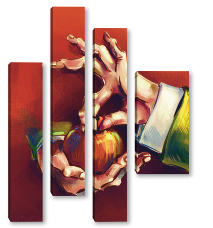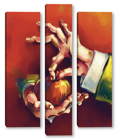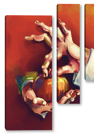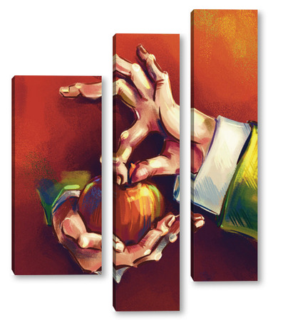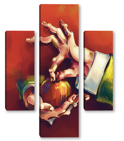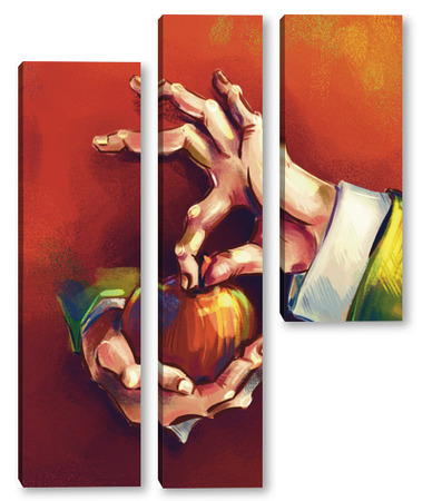 Модульная картина Выразительные руки, держащие яблоко на терракотовом фоне, натюрморт Выразительные руки, держащие яблоко на терракотовом фоне, натюрморт