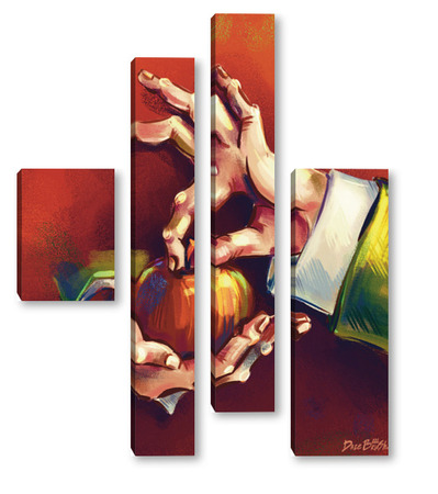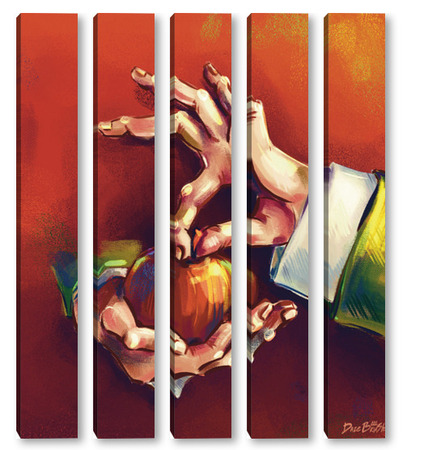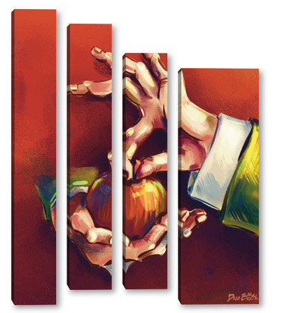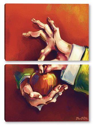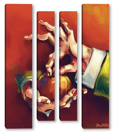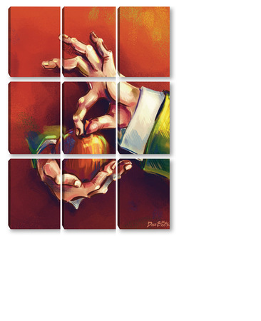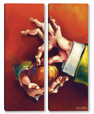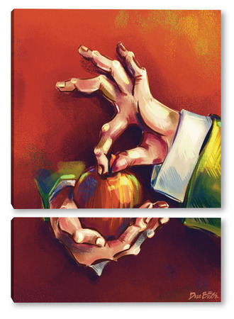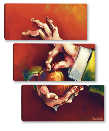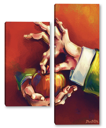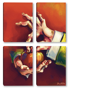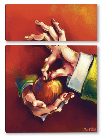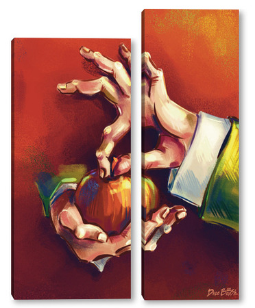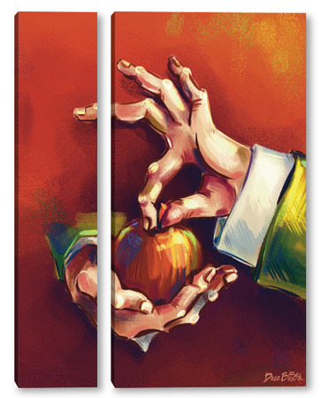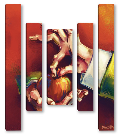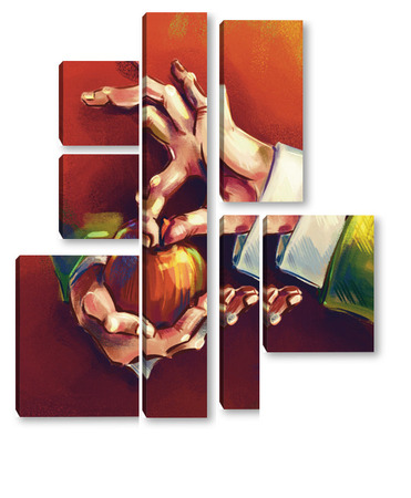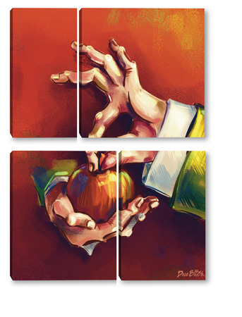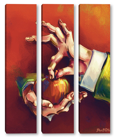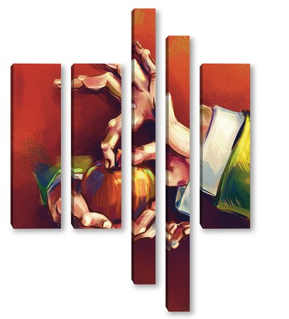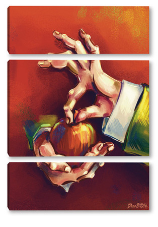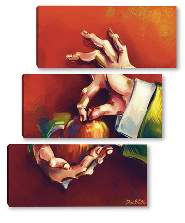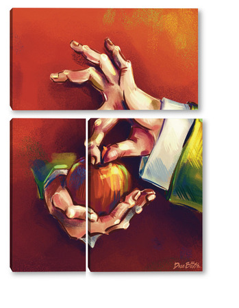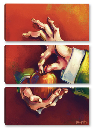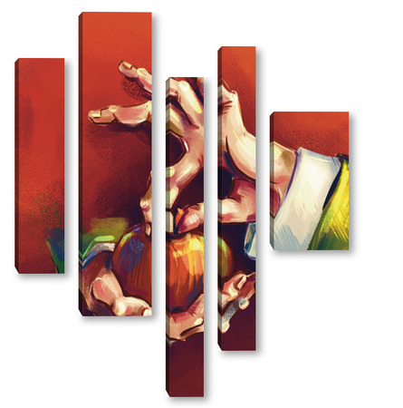Модульная картина Выразительные руки, держащие яблоко на терракотовом фоне, натюрморт Выразительные руки, держащие яблоко на терракотовом фоне, натюрморт