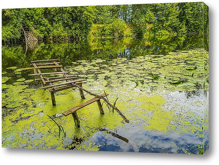 На дворе лето,все вокруг укрыто зеленым цветом.На реке своя жизнь:упавшие в воду деревья,заброшенные рыбацкие места,небо отражается в спокойной глади реки.