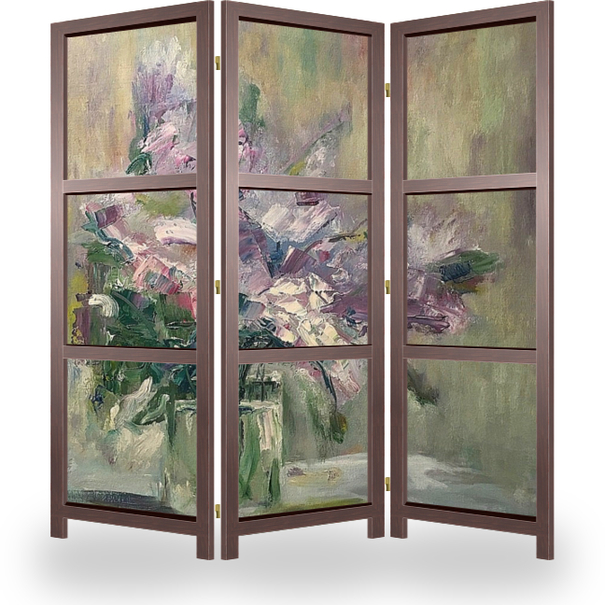 В композиции картины написан букет сирени, Вместе с небольшой вазой он заполняет всю центральную часть, почти достигая его верхнего края. Сирень всегда является украшением любого интерьера, особенно в короткий период её цветения.Картина будет украшат