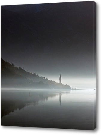 Тихое январское утро. Над водой разливался туман вперемешку с дымом из печей. В Черногории нет центрального отопления и люди обогреваются печами. На фоне горы, в тумане, вырисовывается колокольня в г. Пераст