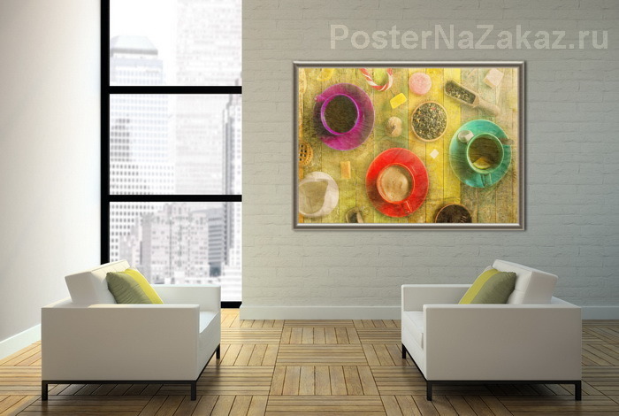 Картина с изображением разноцветных чашек ароматного кофе и различных сладостей украсит вашу кухню и создаст приятную атмосферу.