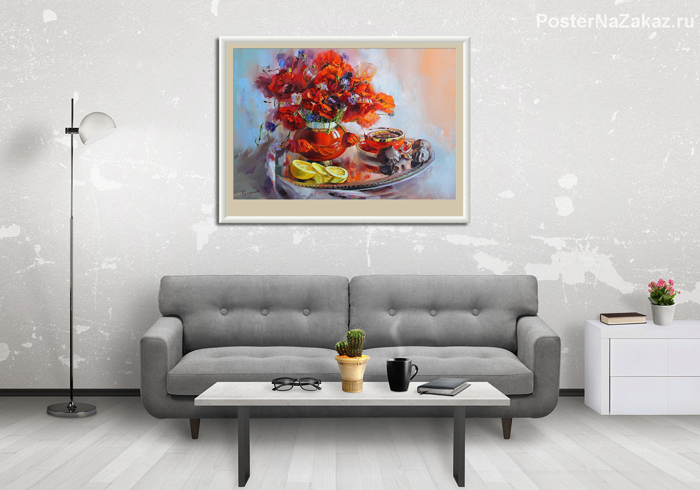 Изображение букета маков. Чаепитие с лимоном и зефиром. Маки в теплом доме украсит любое помещение, хороший подарок.