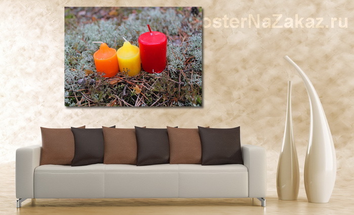 три восковые яркие свечи стоят на белом сухом мху в лесу приготовленные для медитации