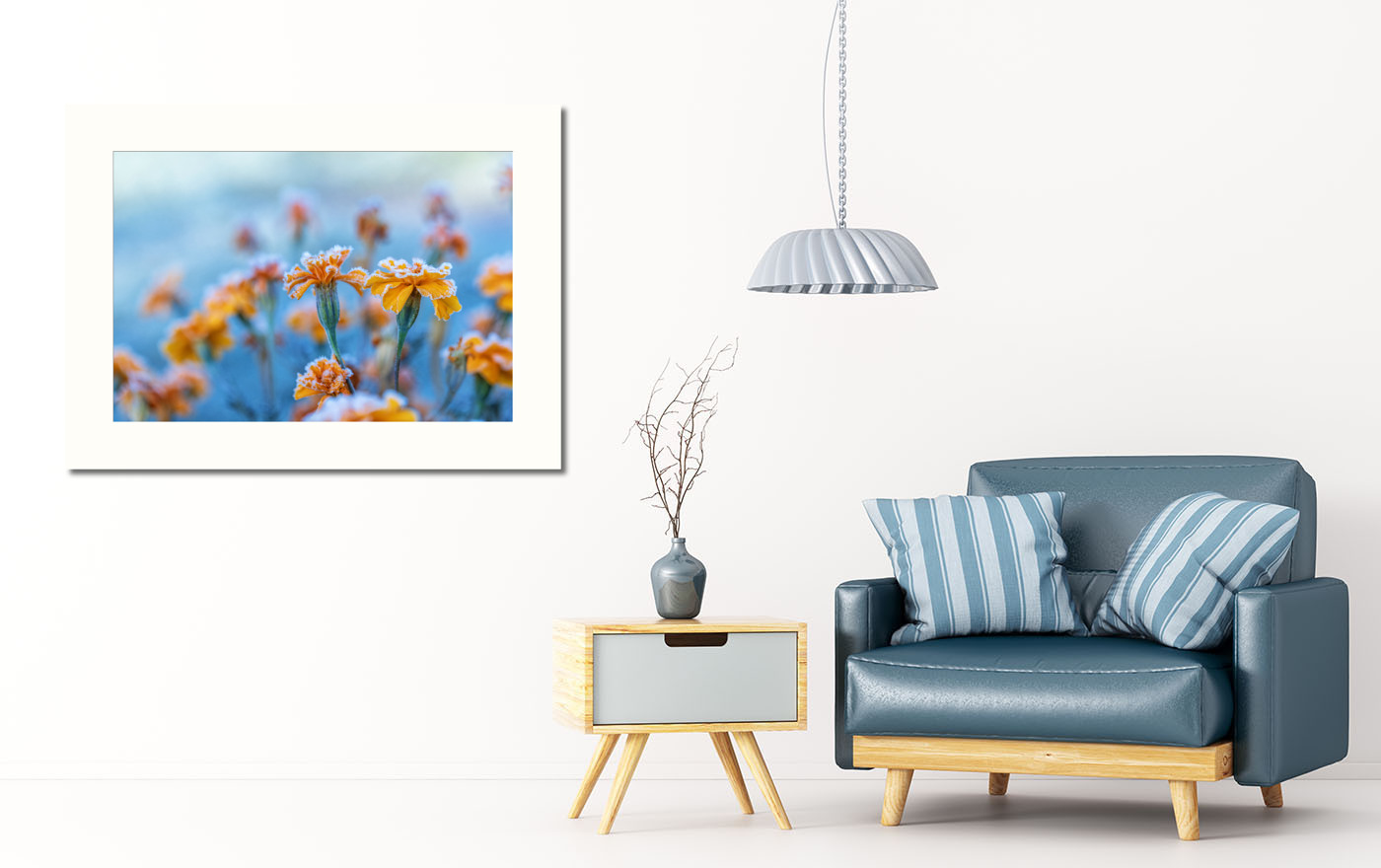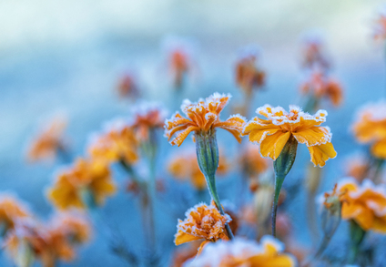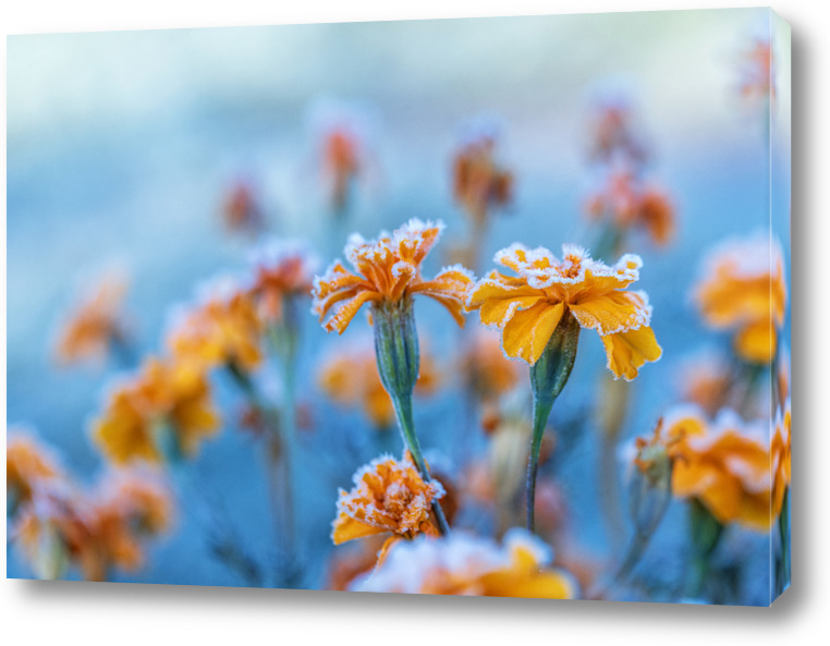 Яркие оранжевые цветы бархатцы покрытые колючими холодными кристаллами инея осенним морозным утром