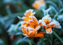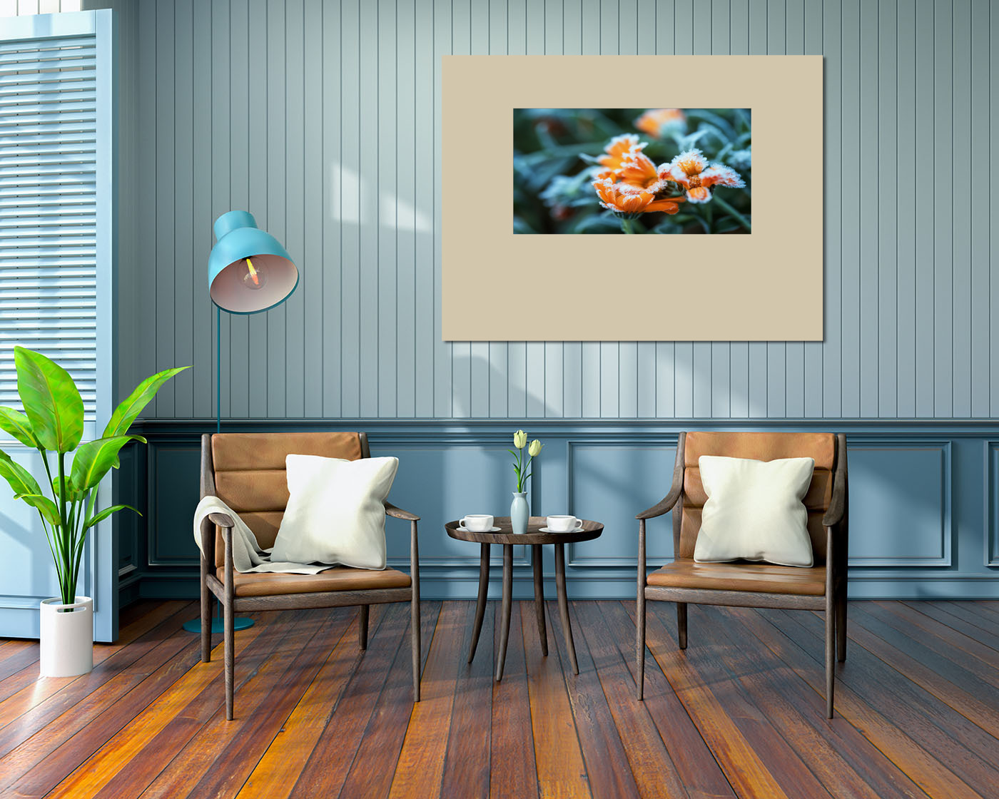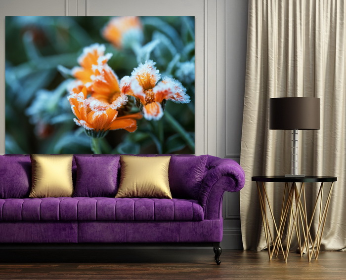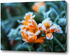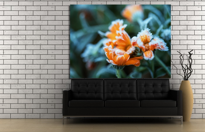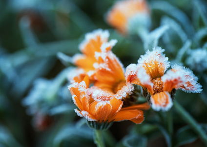 цветы календулы покрытые холодными кристаллами инея в морозное осеннее утро