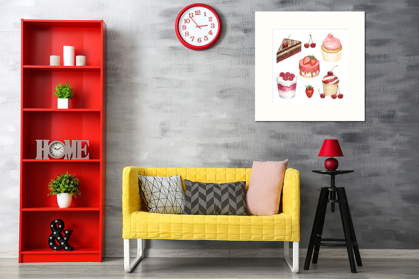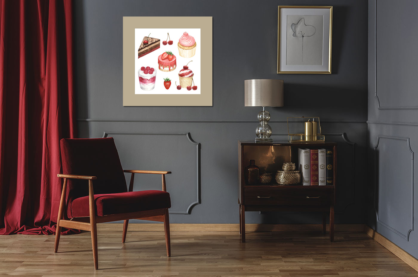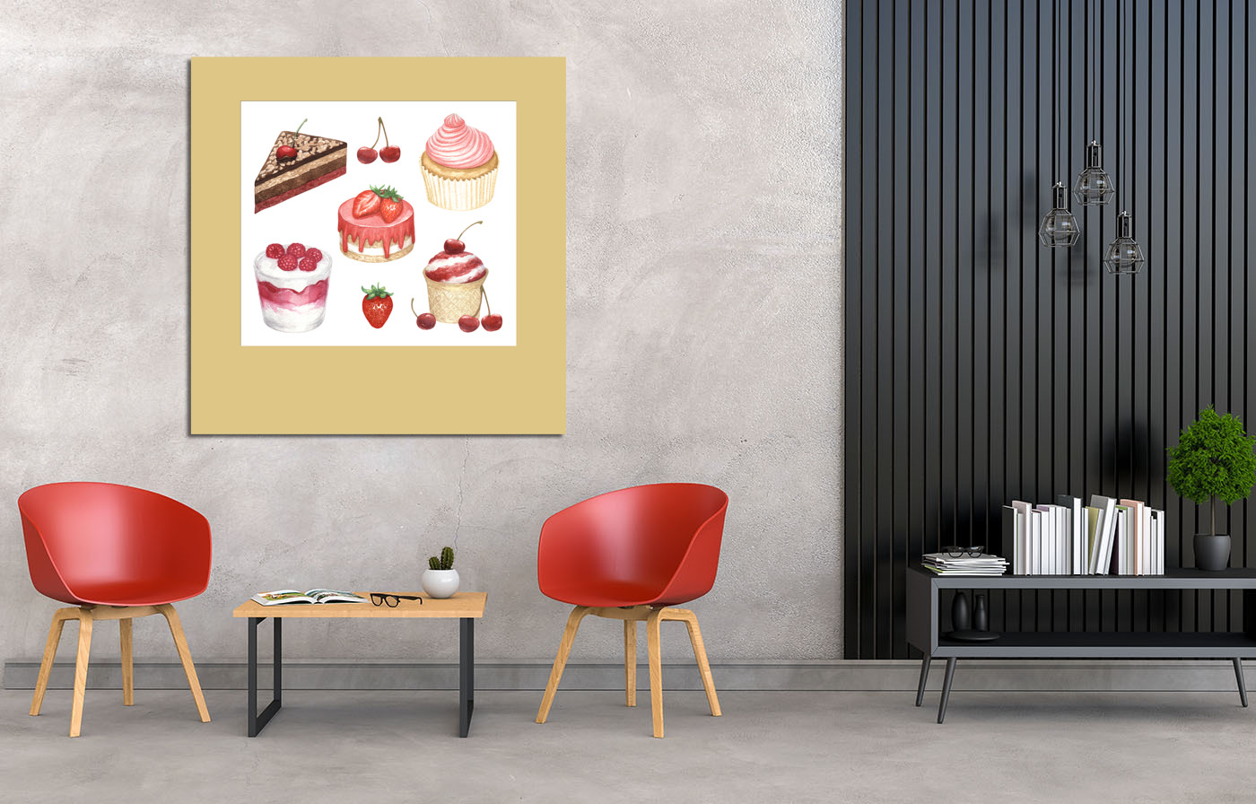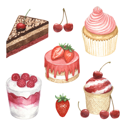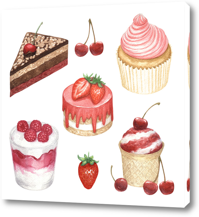 Коллаж из десертов, нарисованных акварелью, - отличный вариант постера на кухню. Также подойдет для украшения кофейни.