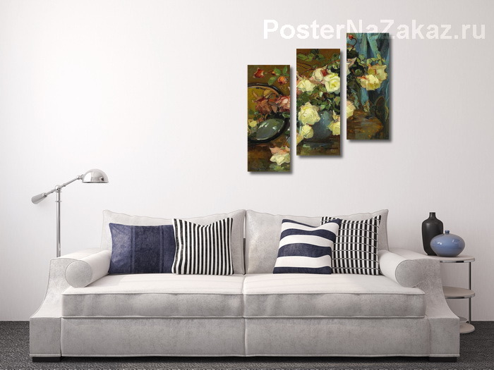 Модульная картина Розы в голубой вазе на столе с зеркалом
