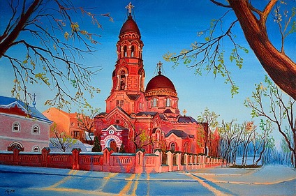 Холст/масло, 2015. Умиротворяющее настроение вечерних красок и отражений старой церкви. Кажется сама Богородица покрывает успокоением весь город. Тени от заходящего солнца протянулись по дороге.