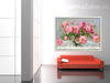 Живописный холст размером 50-70см выполнен в светлых тонах. Атласные складки скатерти на столе подчеркивают легкость холста. В центре натюрморта находится ваза с раскидистым букетом розовых пионов