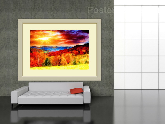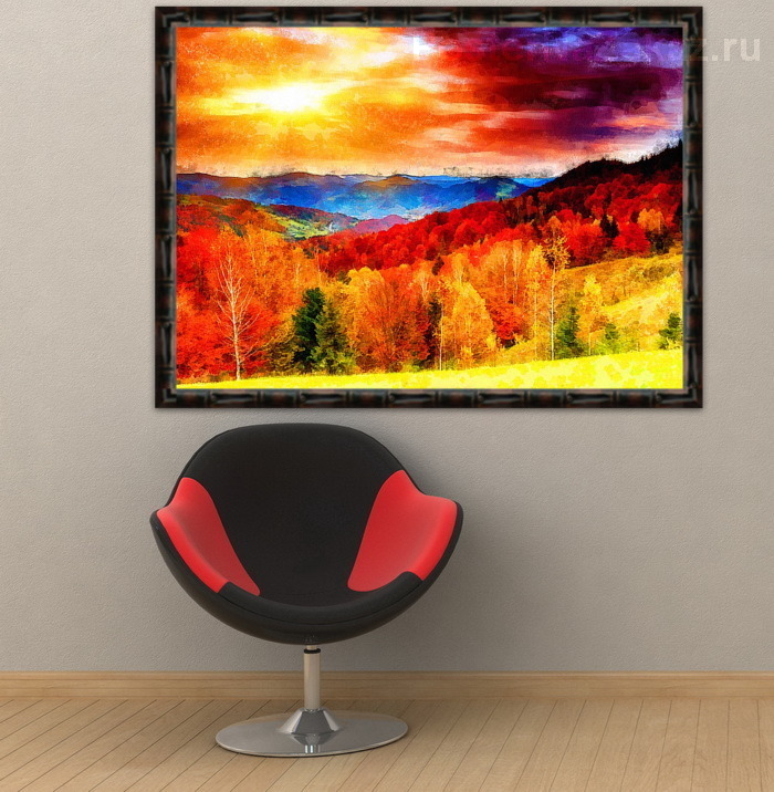 На картине изображен осенний пейзаж. Картина выполнена в специальной графической технике с обработкой под акварель
