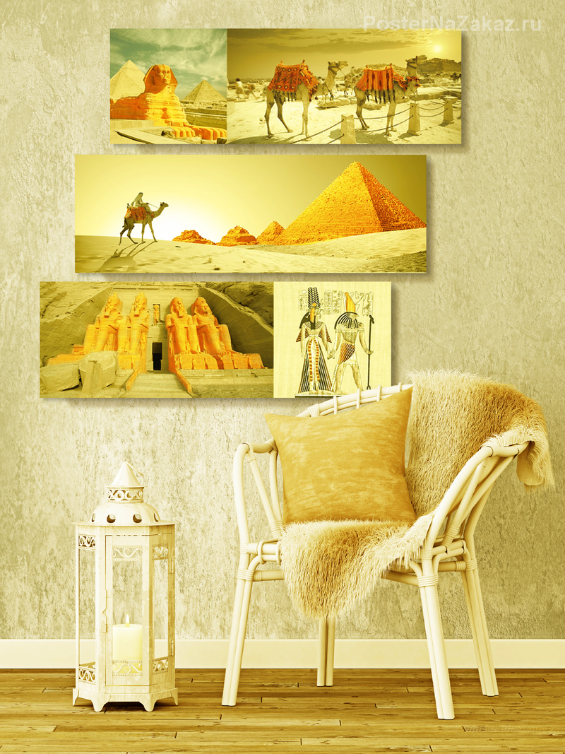 Коллаж из изображений Египетских пирамид, архитектурных элементов, замечательное, завораживающее дополнение для ваших комнат. Подойдет для спален и гостиных, которые выполнены в теплых тонах.