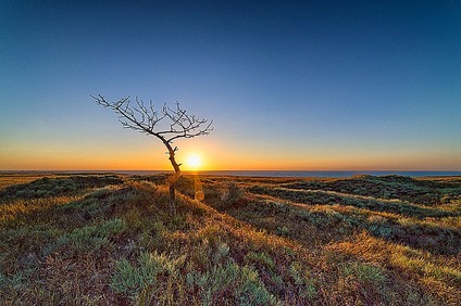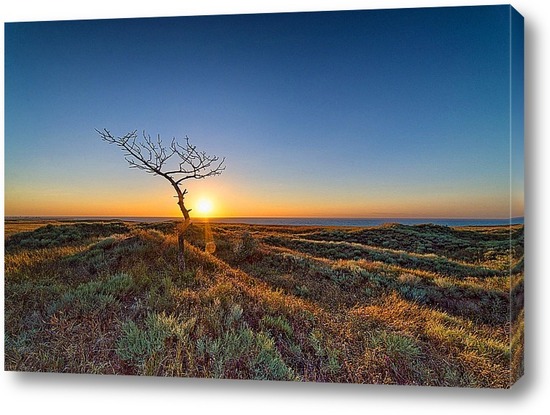 Засохшее дерево на берегу моря, в сочетании с выгоревшей на солнце травой и растениями, результат аномально высокой температуры стоявшей в августе на побережье Чёрного моря.