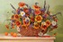 Букет из цветов раннего лета в плетеной корзине, первые абрикосы и вишни в дополнение