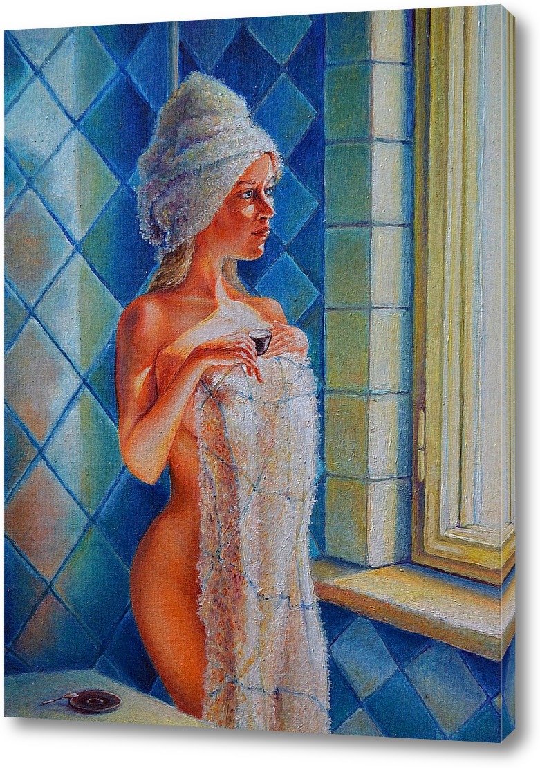Утренний кофе юной девушки, вышедшей из ванной после душа на старой кухне, выложенной синей плиткой, и освещенной ярким прямым солнечным светом. Игра света, цвета и геометрии пространства в преддверии начинающегося дня и чувственность геометрии женск