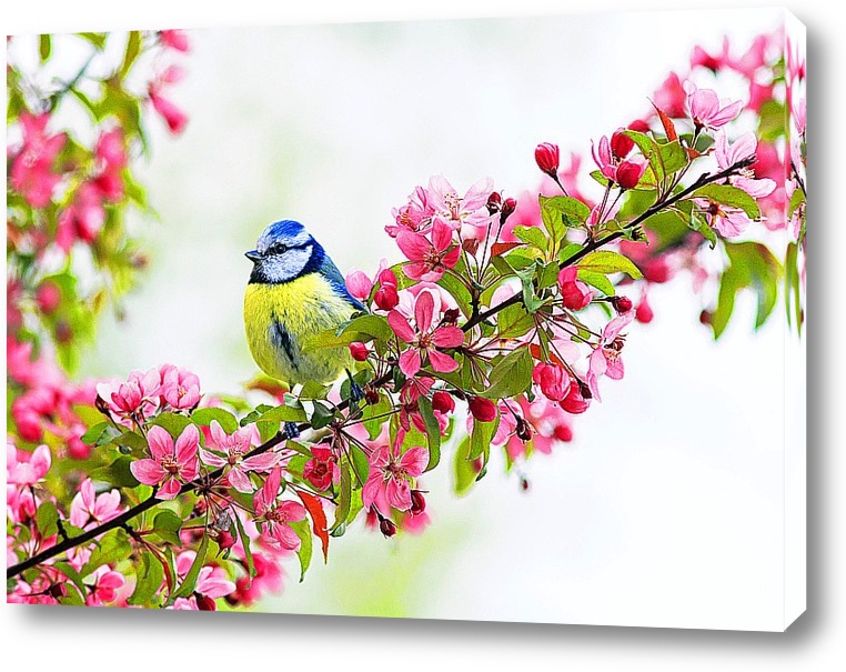 маленькая красивая птица лазоревка сидит среди веток яблони с розовыми майскими цветами