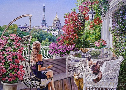 Жанровая картина, изображающая сцену отдыха - дневной кофе юной парижанки, сидящей в плетеном подвесном кресле, на открытой уютной террасе одного из парижских домов. В компании двух очаровательных кошек, в окружении традиционных для Парижа изящных цв