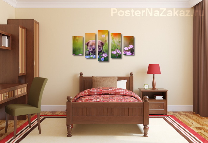 портрет милого коричневого щенка сидит на летнем лугу среди красивых ярких цветов