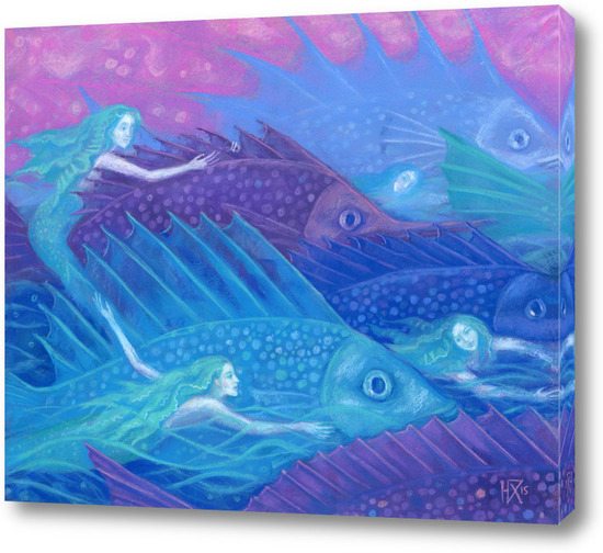 Русалочки и гигантские рыбы, плывущие в море. Фэнтези . сюрреализм, пастельная живопись, розовые, голубые и фиолетовые тона