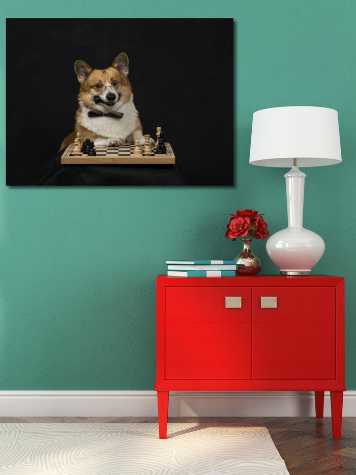 милый забавный щенок собаки корги стоит у шахматной доски и играет партию