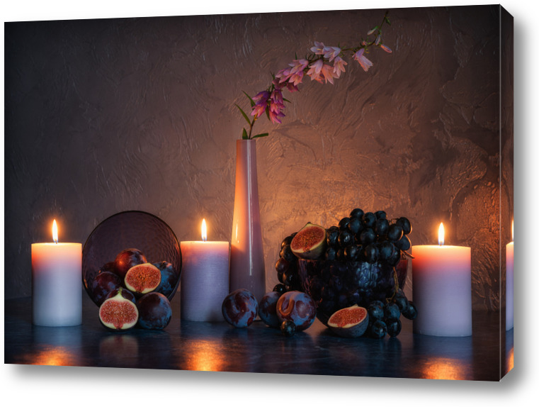 Домашний натюрморт на кухонном столе в теплых тонах со свечами,инжиром и виноградом.