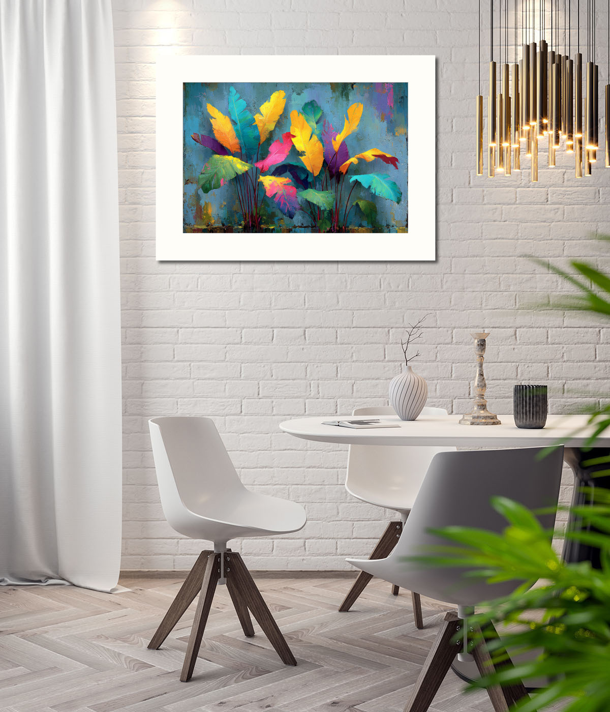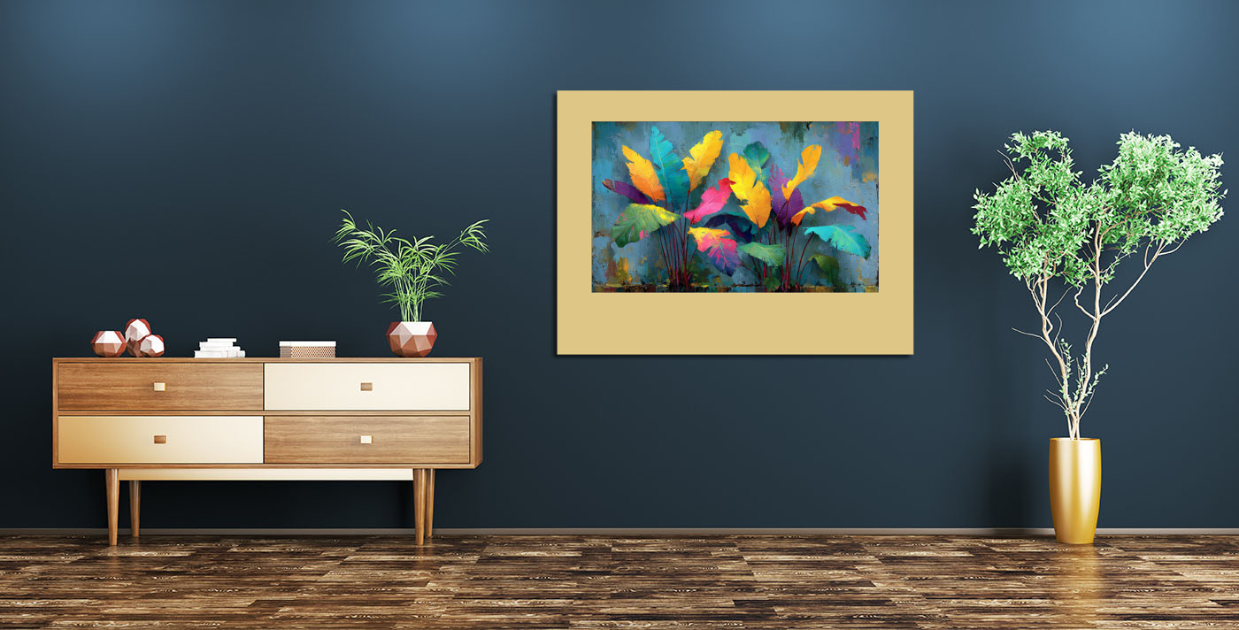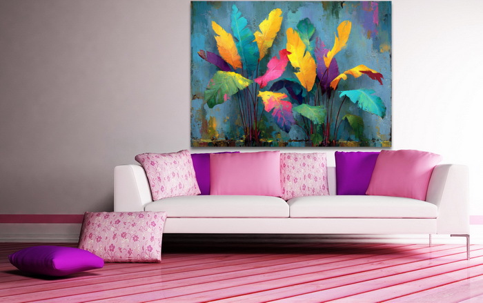 Яркая абстрактная картина с изображением экзотических листьев в насыщенных оттенках: жёлтом, розовом, бирюзовом, фиолетовом и зелёном. Фон в холодных серо-голубых тонах подчёркивает выразительность композиции. Жирные мазки и динамичные формы создают