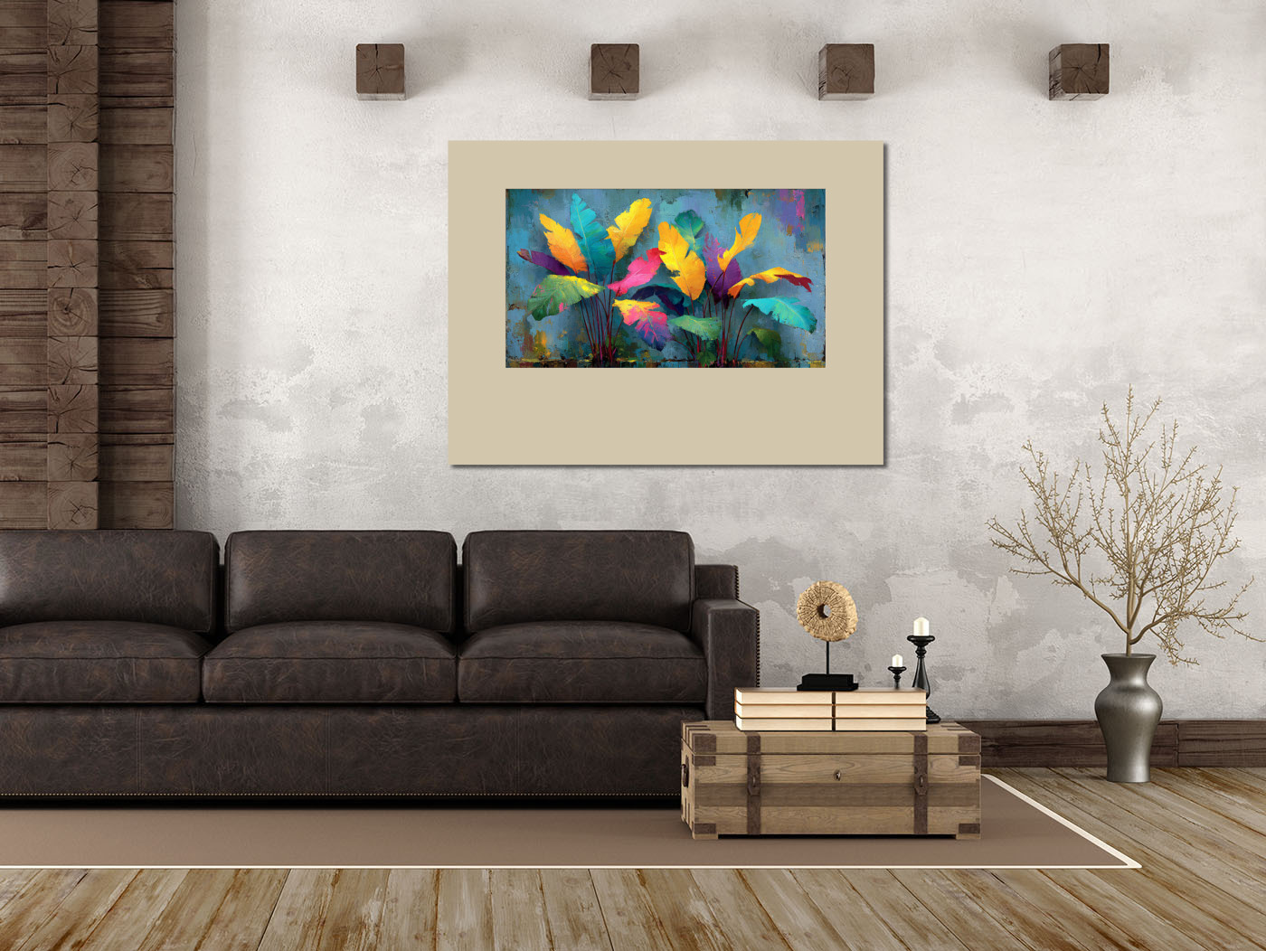 Яркая абстрактная картина с изображением экзотических листьев в насыщенных оттенках: жёлтом, розовом, бирюзовом, фиолетовом и зелёном. Фон в холодных серо-голубых тонах подчёркивает выразительность композиции. Жирные мазки и динамичные формы создают