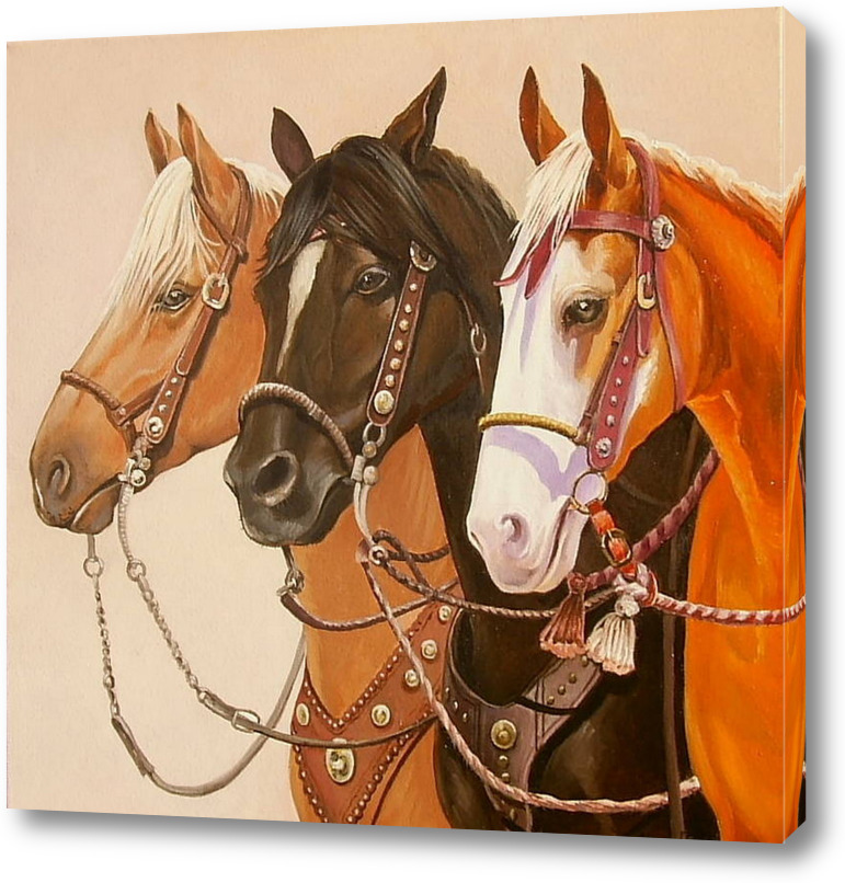 картина написана маслом на холсте, размер подрамника 60 х 60 см. На картине изображена тройка красивых лошадей. Эта картина украсит интерьер спальной комнаты.