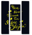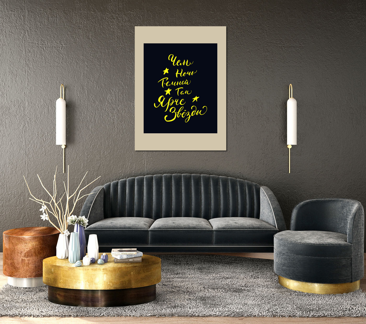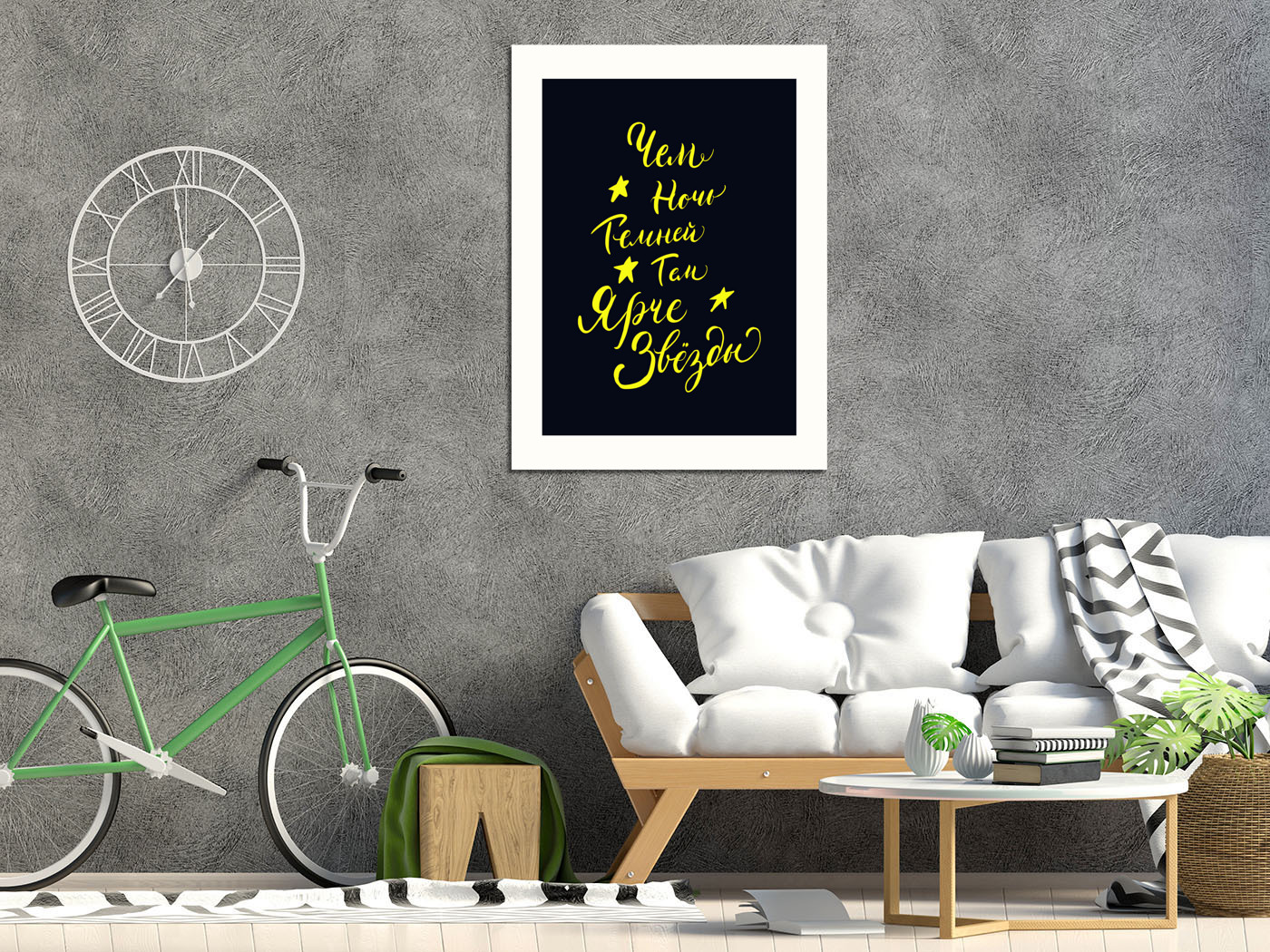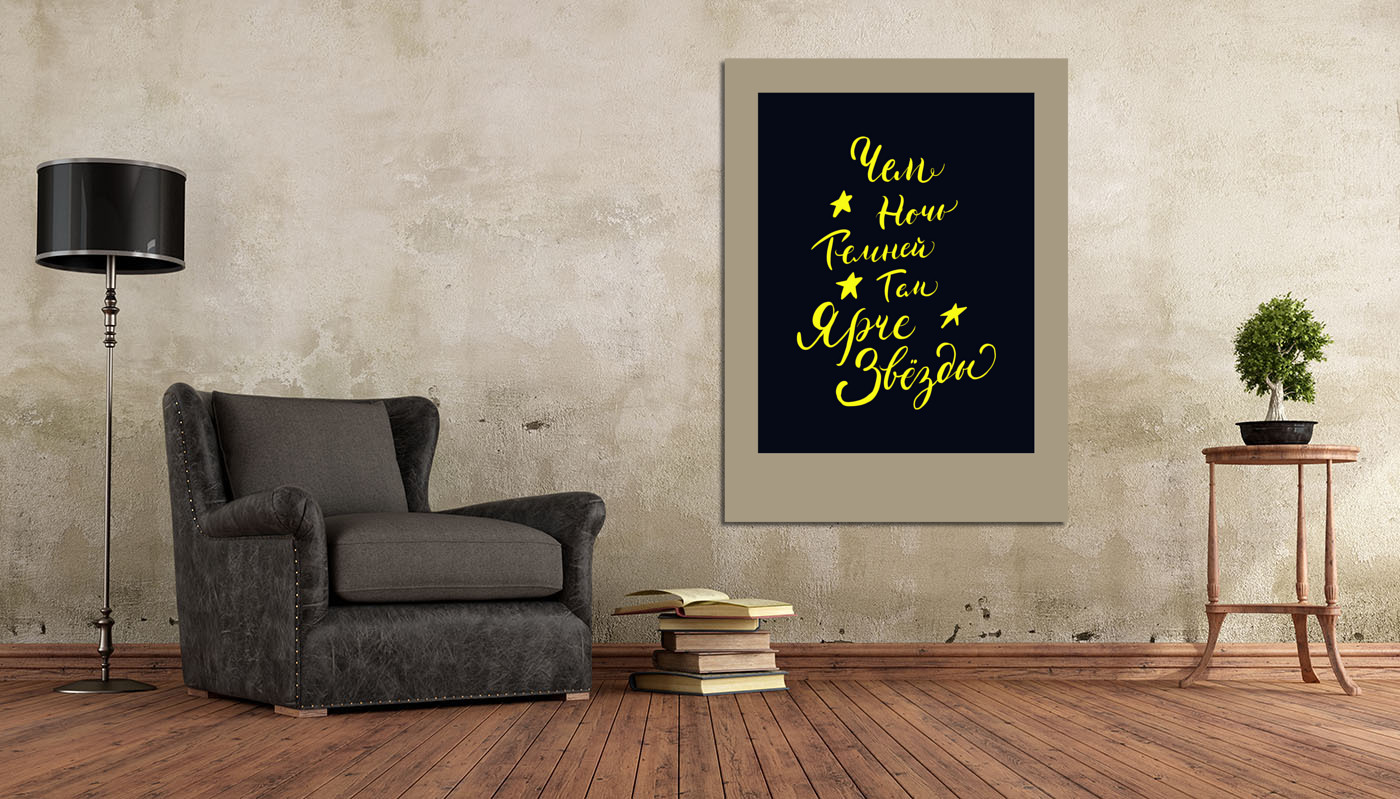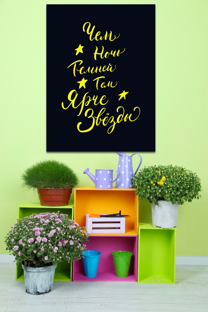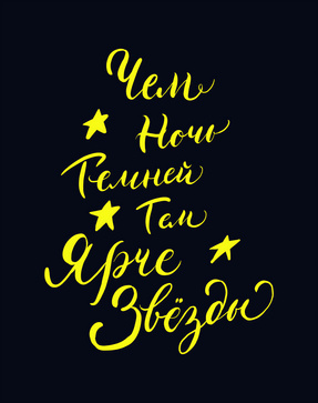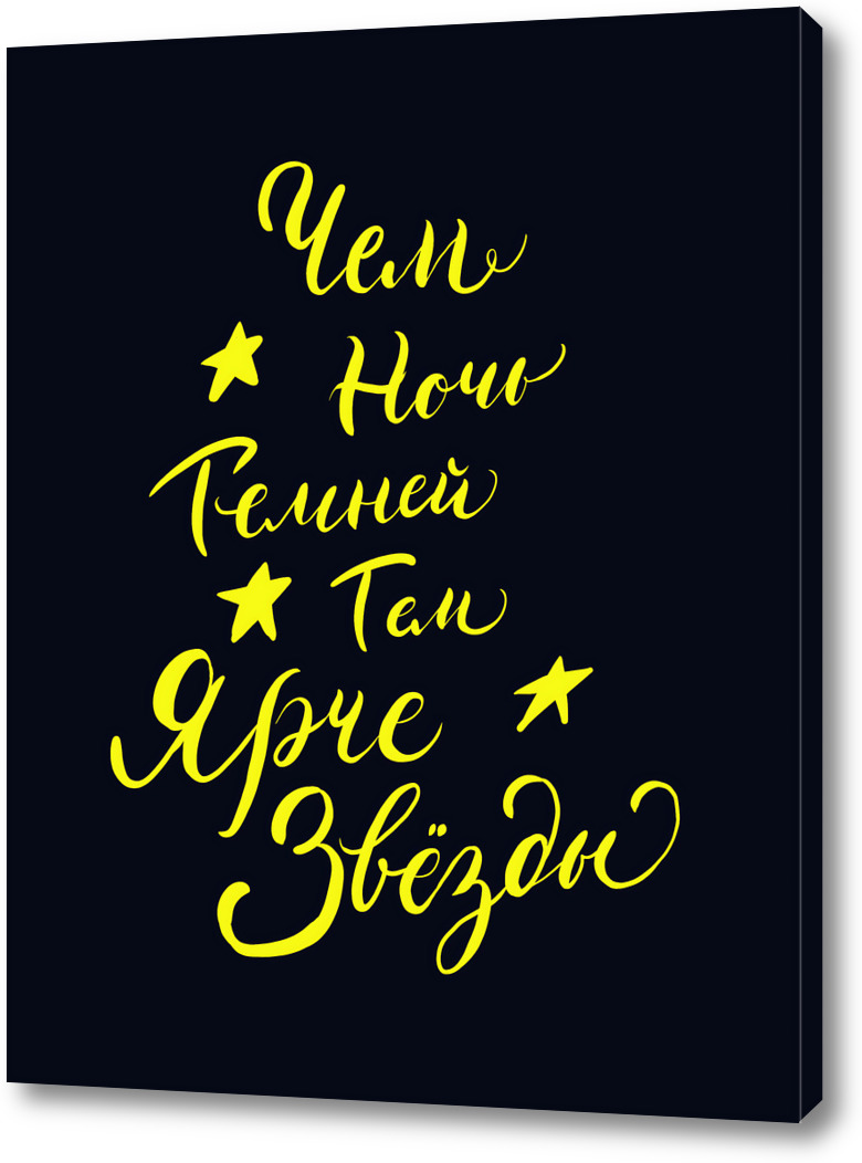 На изображении тёмно-синий фон, на котором крупным каллиграфическим шрифтом жёлтого цвета написана фраза: "Чем ночь темней, тем ярче звёзды". Между строчками текста расположены маленькие жёлтые звёзды.