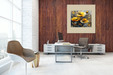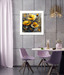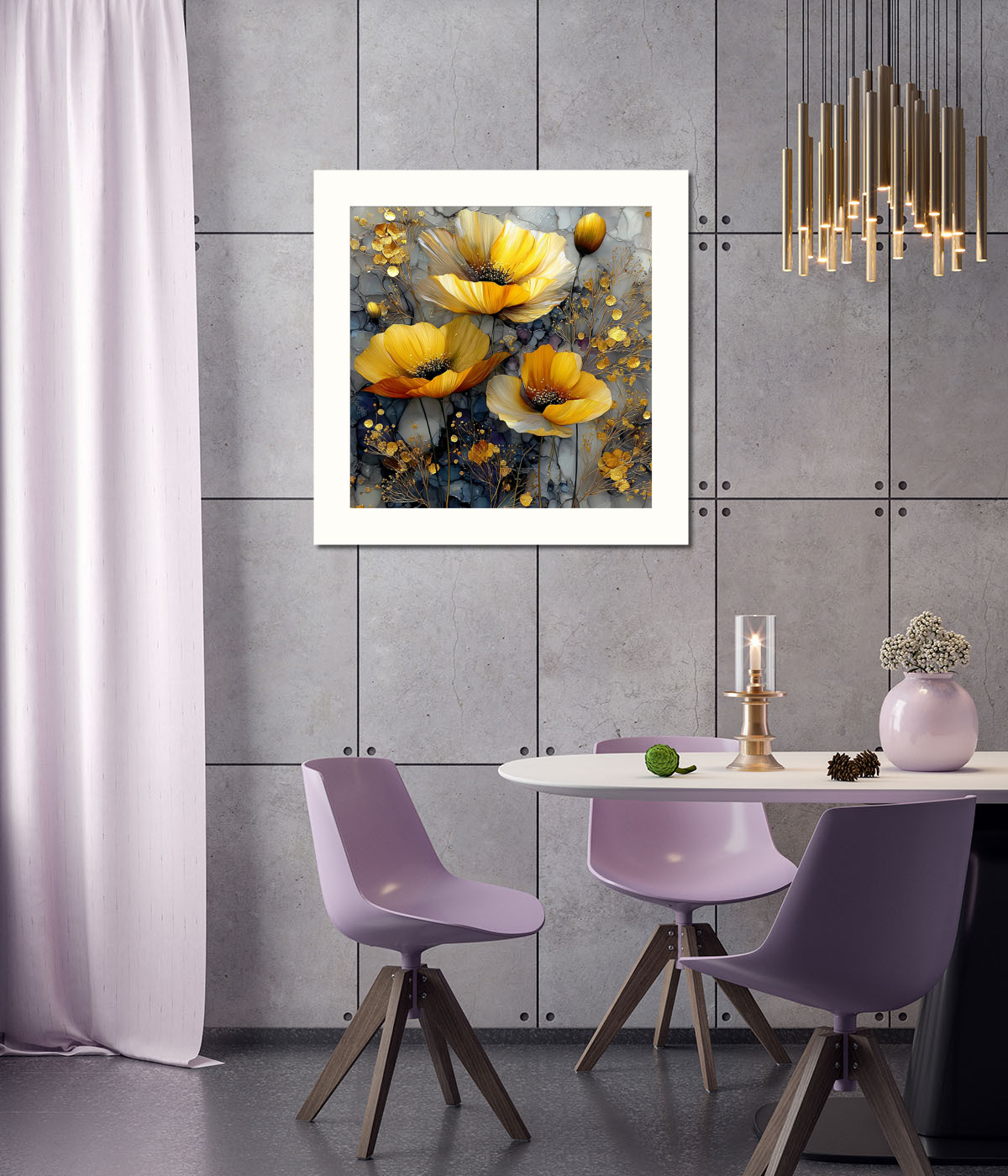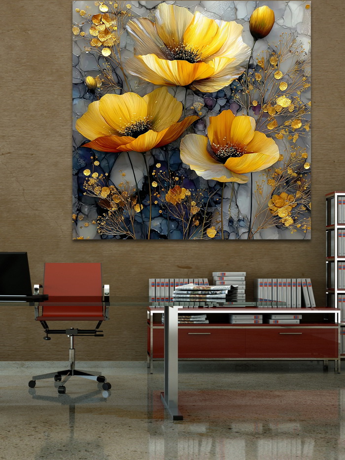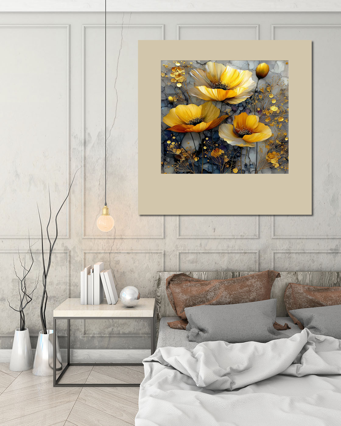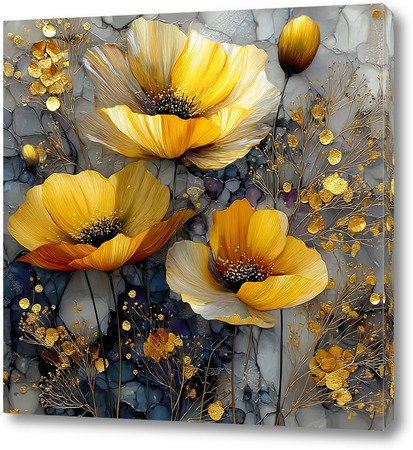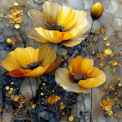 На картине изображены крупные жёлто-золотистые цветы с выразительными лепестками и тёмными сердцевинами. Композицию дополняют изящные веточки с мелкими золотыми элементами, создающими ощущение лёгкости и воздушности. Фон выполнен в серо-голубых мрамо