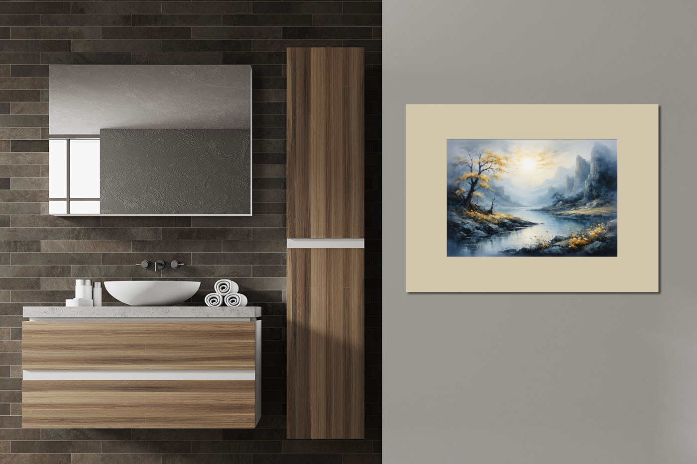 Картина "Умиротворение. Туманные скалы и золотое дерево у воды"