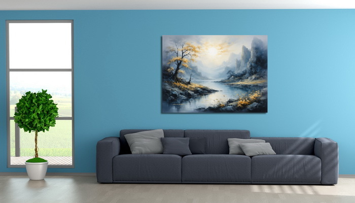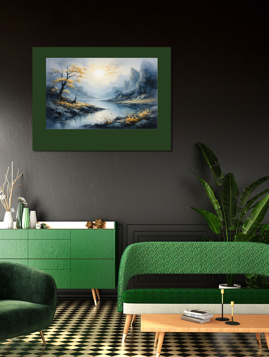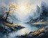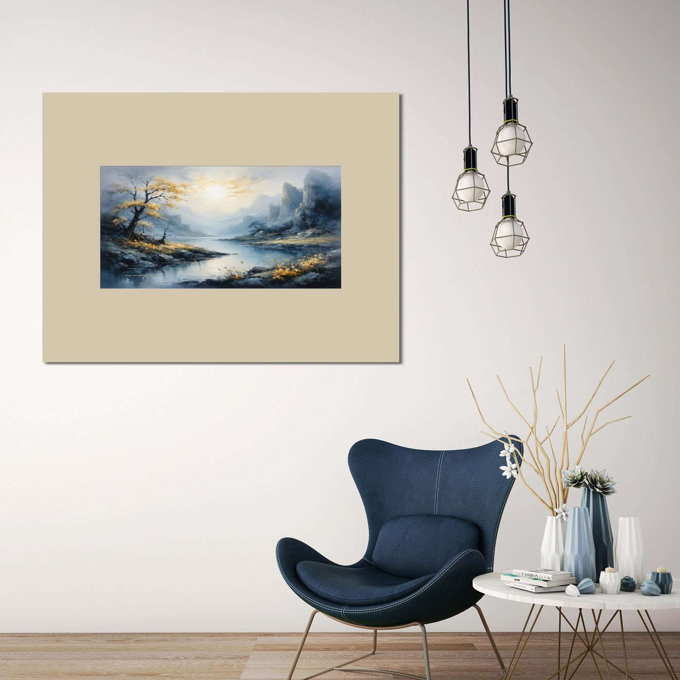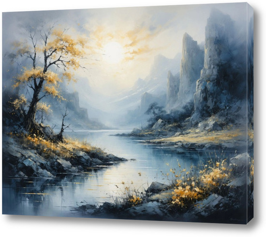 Картина "Умиротворение. Туманные скалы и золотое дерево у воды"