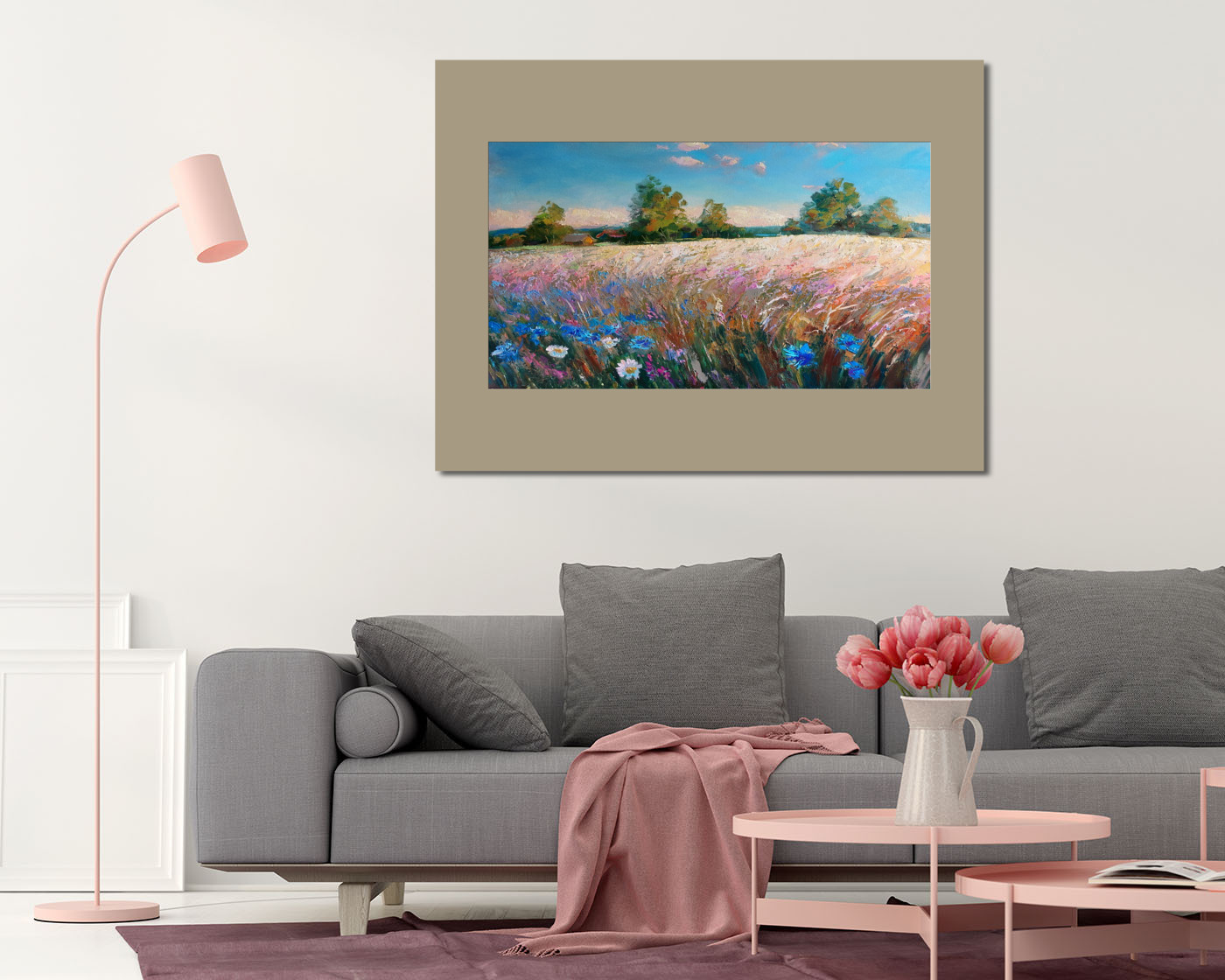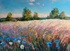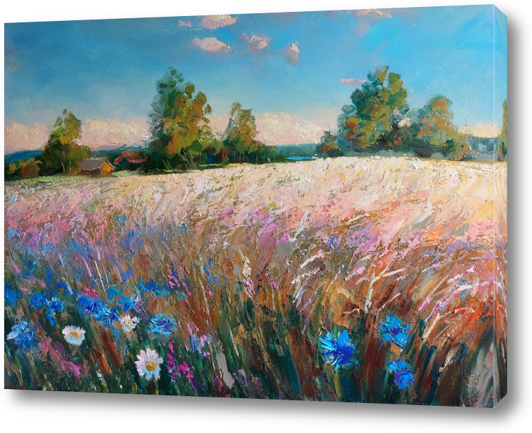 Летний пейзаж с полем пшеницы и цветами. Тёплый летний день в деревне .