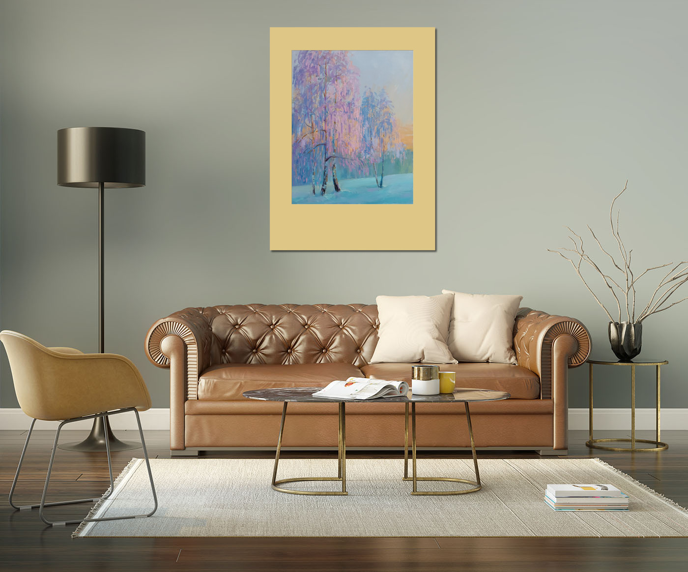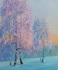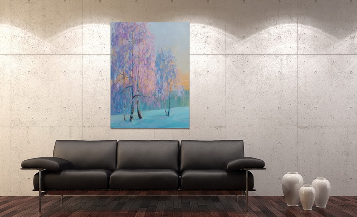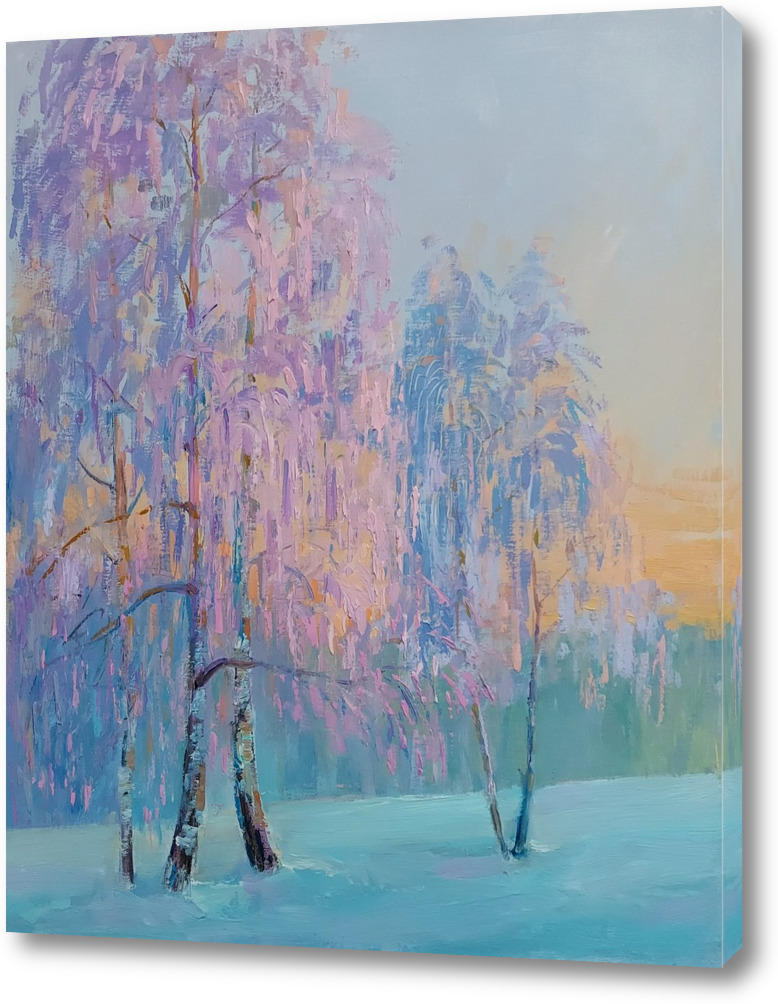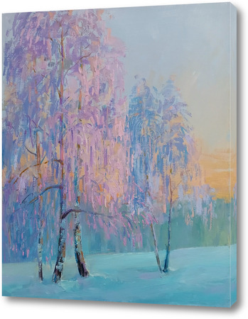 Пейзаж зимний, с березами , морозное утро. Иней на деревьях красиво отражает свет неба.